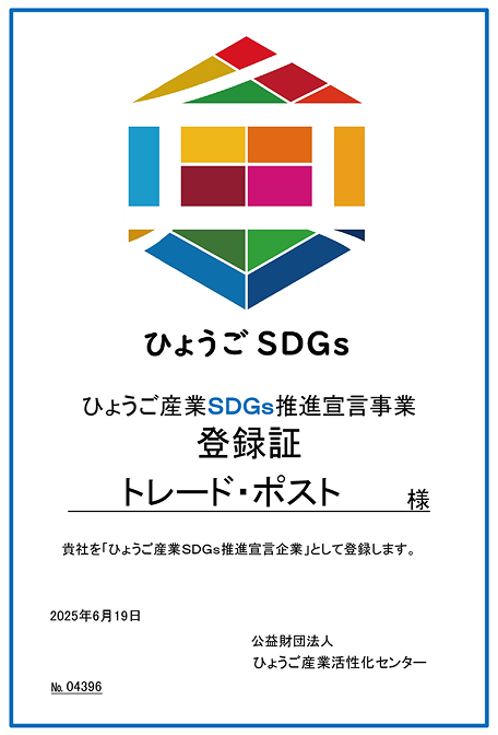 兵庫県が県内中小企業のSDGs推進を支援する「ひょうご産業SDGs推進宣言事業・認証事業」において、当社はこのたび、SDGs推進企業としての認定を受けました。 社会課題の解決に向けた継続的な取り組みを通じて、SDGsの達成に貢献してまいります。